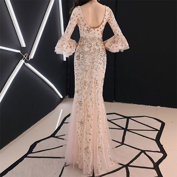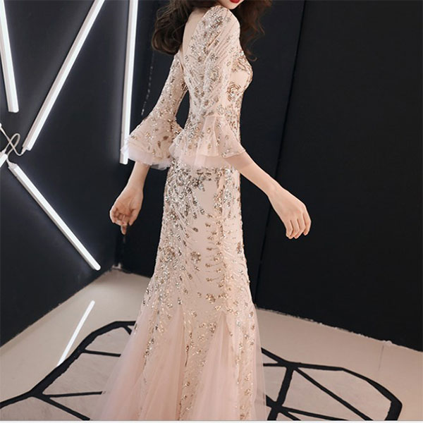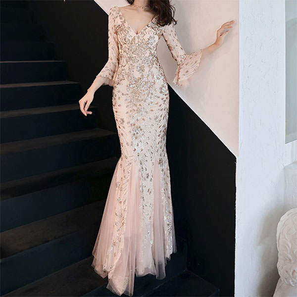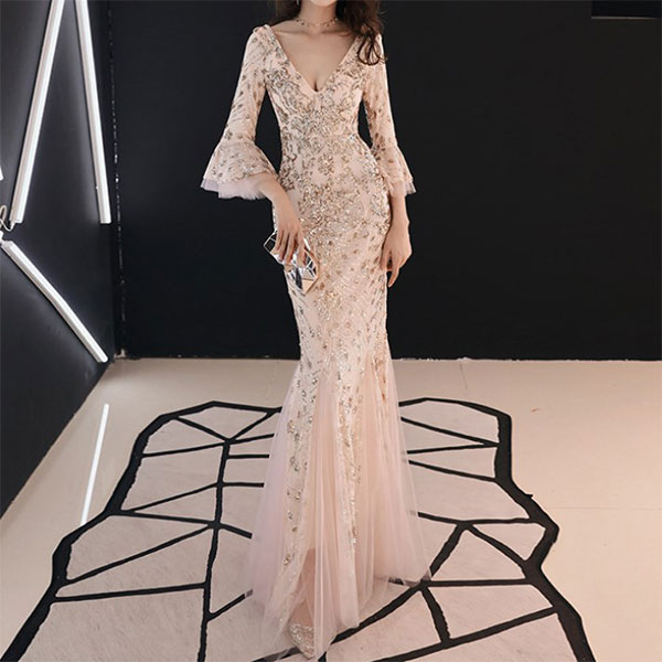 ゴールドの刺繍が華やかなマーメイドラインのロングドレス。