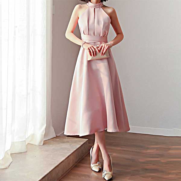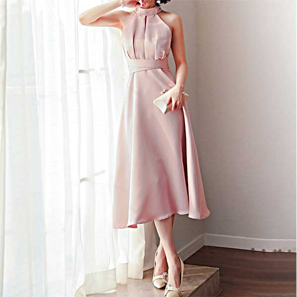 フェミニンなピンクが大人可愛いAラインドレス。