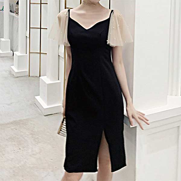 シフォンのフレアスリーブが大人可愛いミディ丈ドレス。