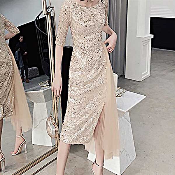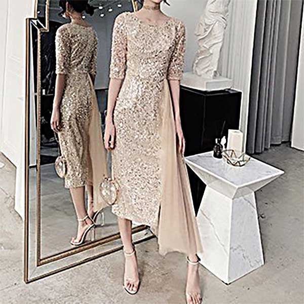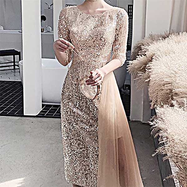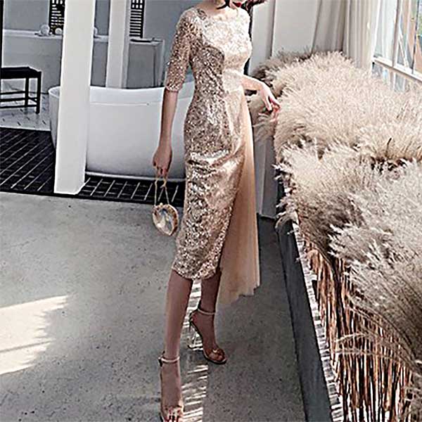 シフォンをあしらったアシンメトリーなスカートが洗練された印象のミディ丈ドレス。