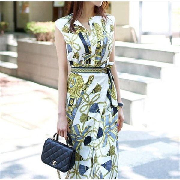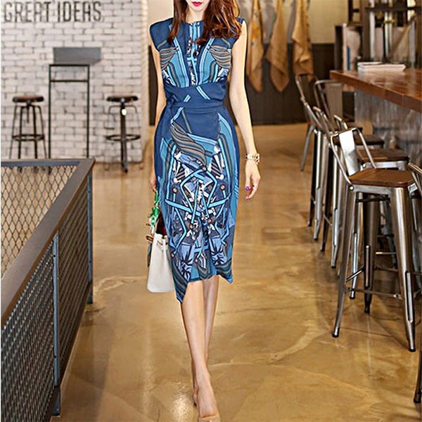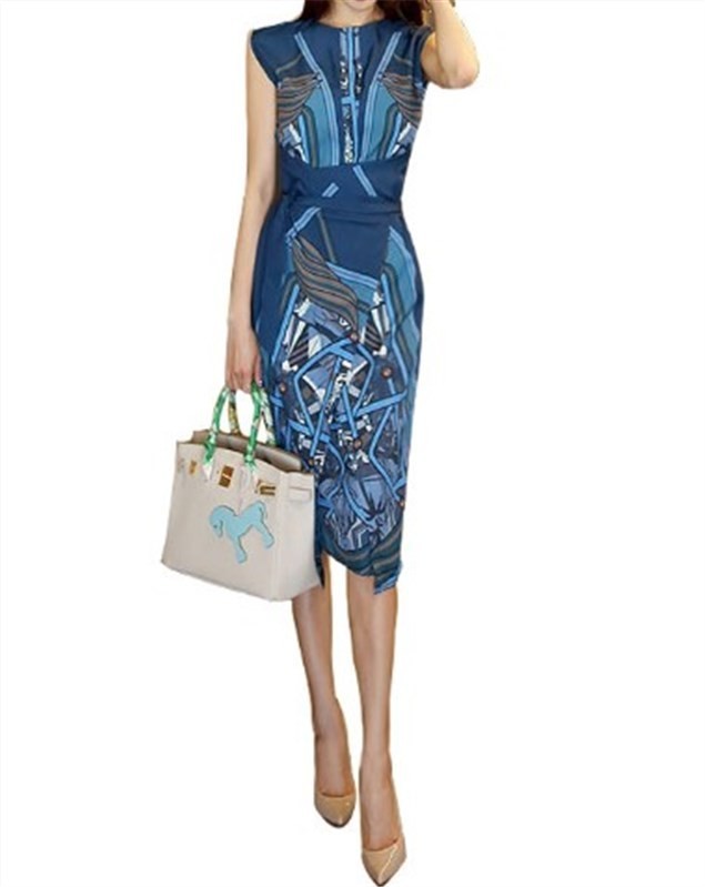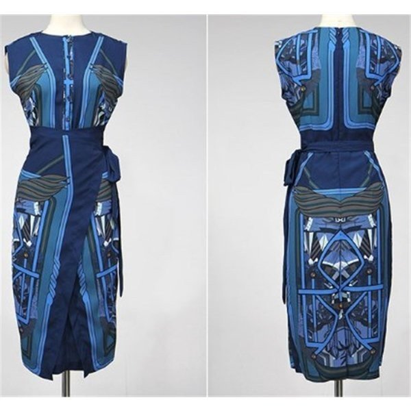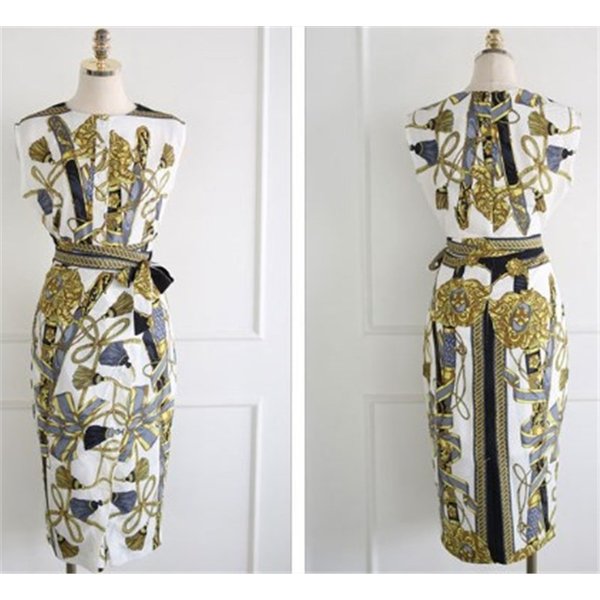 スカーフ柄のプリントが目を引く美シルエットなタイトワンピース 通勤からパーティ、イベント、お仕事などに 周りに差をつける装いがしたい時にお勧めです。