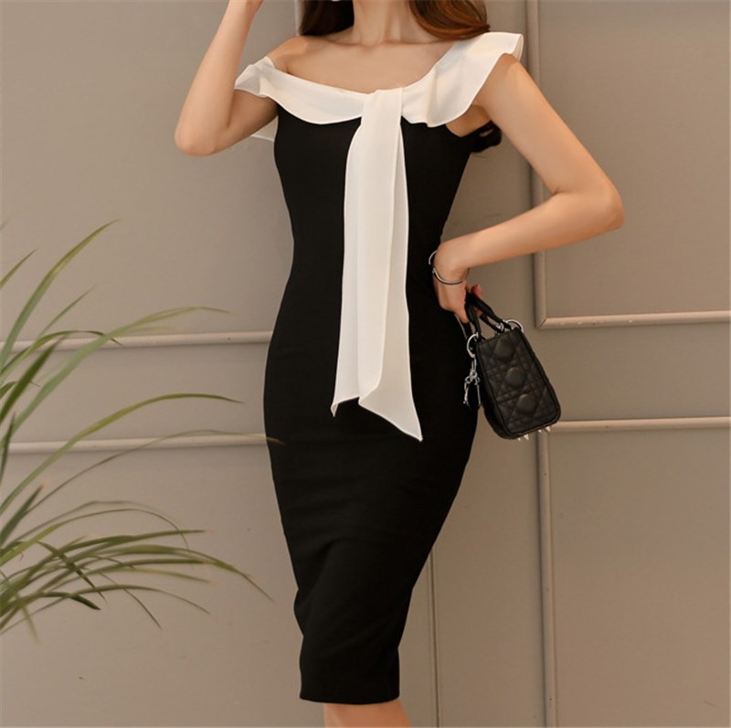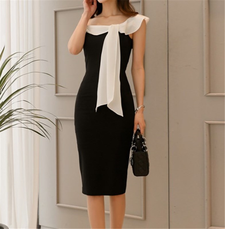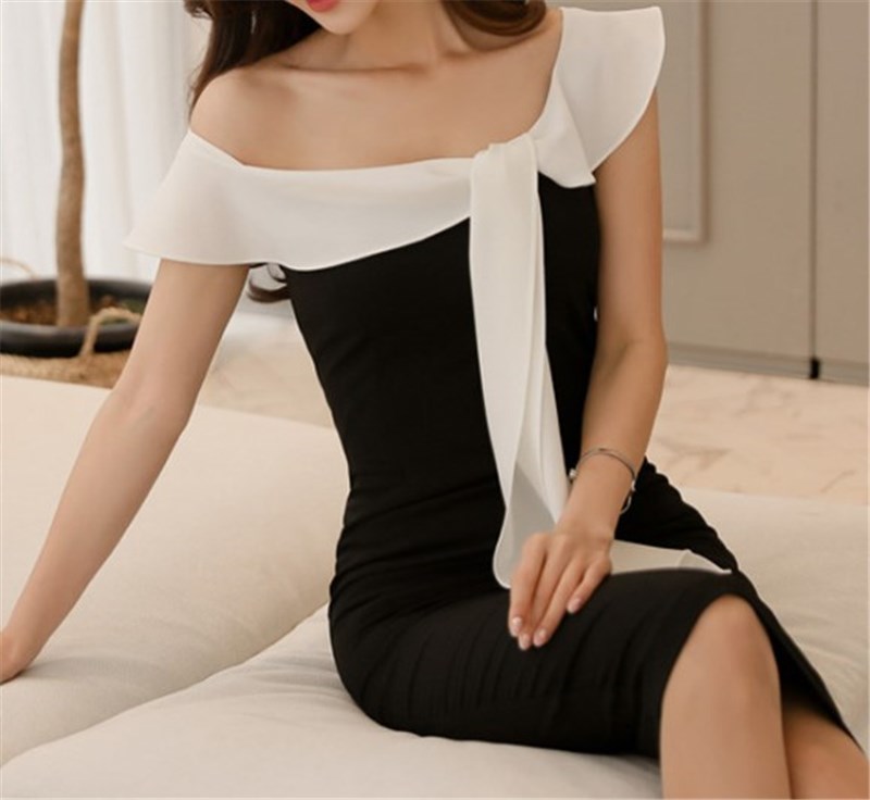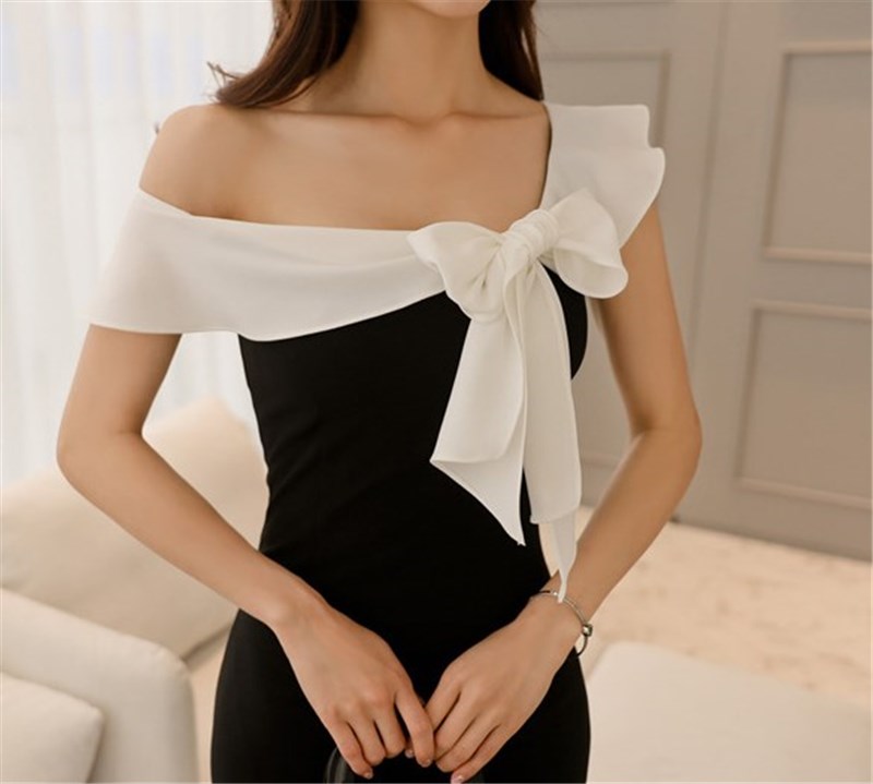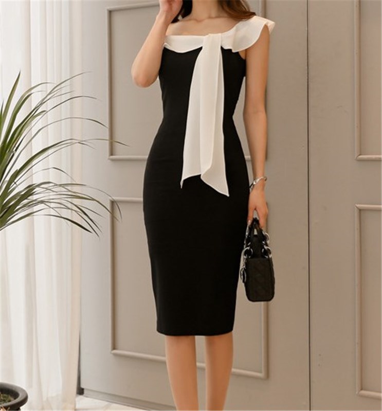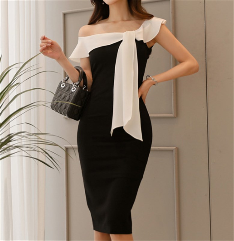 デコルテを女性らしく綺麗に魅せてくれるオフショルダーのワンピース シックなモノトーンで上品な印象 美しく計算されたタイトライン 通勤からパーティ、イベント、お仕事などに 周りに差をつける装いがしたい時にお勧めです